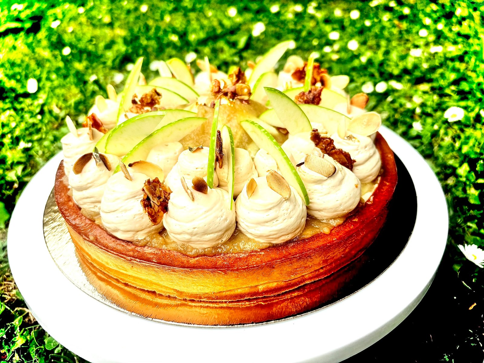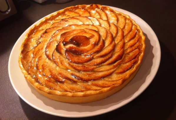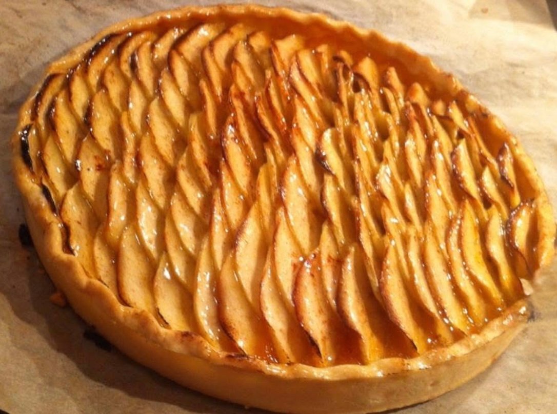 De fines lamelles de pommes fondantes soigneusements nappées s’enlacent sur une pâte sucrée dorée et croustillante, libérant leurs parfums délicatement caramélisés. un dessert intemprel, où simplicité et élégance se rencontrent dans chaque bouchée