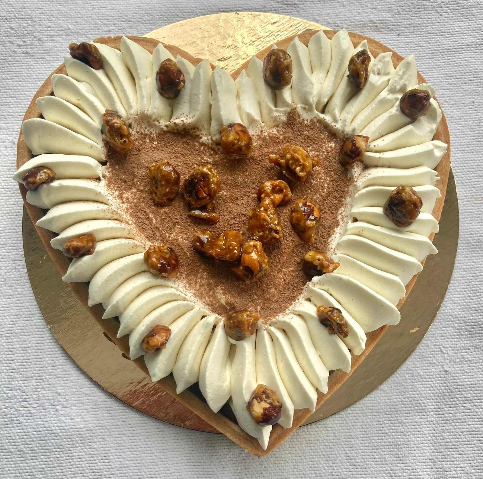 Par dessus, une ganache onctueuse à la vanille de Madagascar parsemée de noisettes caramélisées qui brillent comme de petits éclats dorés.
